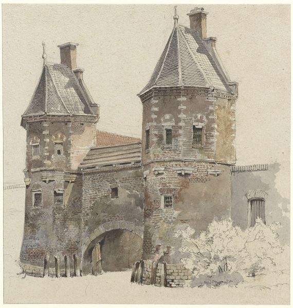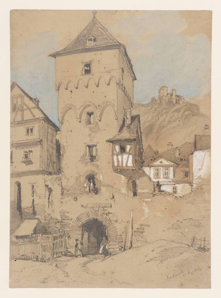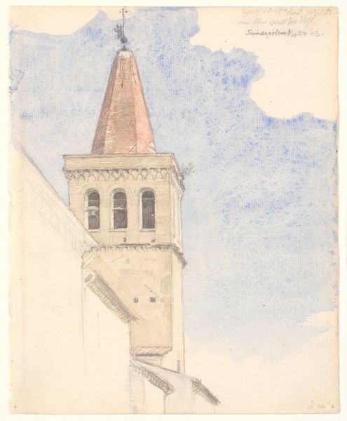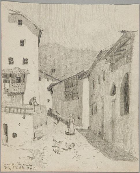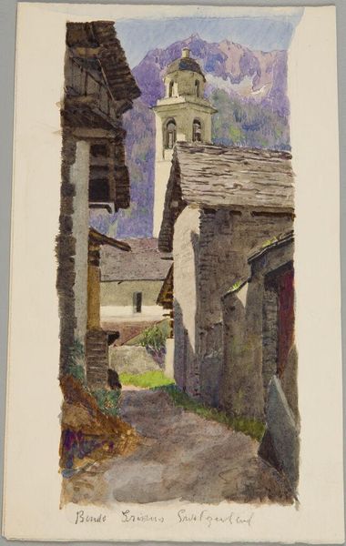 Curator: Denman Waldo Ross's watercolor, "Street Scene, St. Wolfgang, Salzkammergut, Austria" captures a quiet moment in this Austrian town. Editor: It feels… bleached, somehow. Like the sun has been hitting those buildings for centuries, slowly erasing the color. Curator: The near-absence of people emphasizes that feeling, maybe. The steeple is the focal point, drawing the eye upward. The cross on top, of course, is a potent symbol of faith. Editor: The tower does loom. It’s like the village is gathered in its shadow, basking in a kind of protective, holy light. Curator: Yes, and that white emphasizes purity and peace, echoing throughout the composition. Ross seems drawn to architecture as a carrier of meaning. Editor: It’s odd, though. There are hints of human presence, but almost ghost-like. That’s what makes it so arresting, I think. Curator: It does offer a dreamlike quality, lingering in the memory. Editor: Definitely something there to unpack, and maybe revisit.