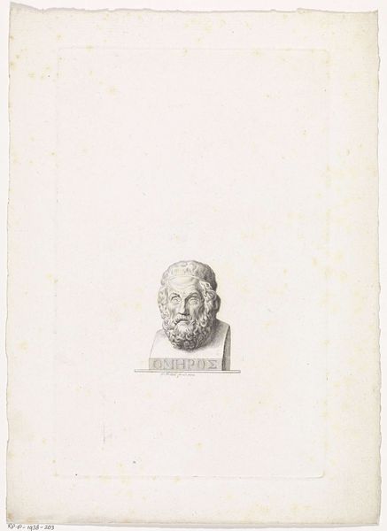 Editor: Here we have P. Mottet’s "Bust of the Greek Poet Homer," an engraving created around 1818. It is rather small, yet strikes me with its stark simplicity. Curator: Indeed, the reduction of form allows the artist to convey Homer's intellectual weightiness. Observe how Mottet uses line to suggest depth and volume, creating a sense of the bust emerging from the ground. Editor: I am drawn to the material process. Think of the engraver’s labor: the careful cutting into the metal, the wiping of ink, and the immense pressure to transfer the image. Curator: The medium undeniably complements the subject. Printmaking, like poetry, allows for wide dissemination of knowledge and cultural values, perfectly embodying neoclassicism. The linearity mirrors the precise nature of classical thought. Editor: Precisely, it raises a fundamental point: printmaking as a process democratized the image of Homer, making the embodiment of classical knowledge available to the broader public. This counters the traditionally exclusive ownership of "high culture". Curator: Note how his expression becomes the focal point. The carefully rendered lines around the eyes suggest inner depth, perhaps alluding to Homer’s visionary capacity. Observe also the symmetry – an embodiment of classicism, further reflected in the bust shape. Editor: Looking at the aging of the paper, its staining and discoloration, offers further testament to how prints are part of lived history and cultural transmission—passing across generations of hands and minds. It adds to our reading of the print and invites the spectator to think of knowledge sharing as part of the cycle of art making. Curator: You make an excellent point about the material object as a witness to history. Returning to its formal elements, consider the contrast between the smooth planes of the face and the intricate details of the hair and beard – a skillful display of technical virtuosity, uniting the human and the ideal. Editor: Seeing it like that allows for fresh ways to consider Mottet’s print as a product and document of its time, while honoring human endeavor and its place in the neoclassical movement. Curator: Indeed, the fusion of technical skill and historical subject matter allows this print to communicate across the ages.
