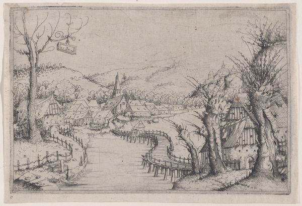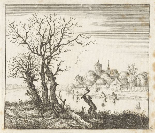 Editor: Here we have Matthäus Merian the Elder's "Monatsbild Januar, oben rechts das Zeichen des Wassermanns," created around 1622. It's an ink and pen drawing on paper. I find the scene quite melancholic; the ruined building looming in the background creates such a sense of transience. How do you interpret the historical context within this image? Curator: That ruin is definitely key. Consider the period - early 17th century. Europe was enduring immense religious and political upheaval. This ruin can be read as a symbol of decaying power structures, maybe even the crumbling foundations of established religious authority. The presence of ordinary folk enjoying winter activities emphasizes daily life continuing amidst change. Editor: So, it's less about literal depiction and more about symbolic representation of societal shifts? Curator: Precisely. Notice where Merian places the "sign of Aquarius", traditionally associated with winter. By linking it to these specific social activities and political implications, Merian invites his public to interpret the present, in this case, 1622, through a lens of astrological and earthly events. The drawing prompts us to contemplate broader social and cultural movements shaping people's existence during a time of great instability. It isn't just a pretty landscape; it's an allegory for its time. How does this perspective reshape your first impression? Editor: I see it now. It becomes less of a melancholic scene and more about the resilience of everyday life amidst instability and change. A fascinating comment on the human condition within socio-political currents! Thank you. Curator: Indeed! Thinking about the interplay between art and broader history makes for a much deeper engagement. I found our talk today equally eye-opening.