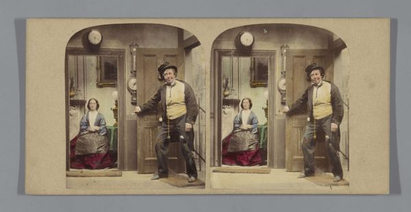 Editor: This quirky stereoscopic print, titled "Tafereel in een huiskamer op 1 april," or "Scene in a living room on April 1st," made sometime between 1852 and 1863 by an anonymous artist, has quite the comedic air. The man in the fez has a gleeful, almost mischievous grin. What’s your read on this playful scene? Curator: Well, immediately I think of a staged joke – those old April Fool’s gags! The photograph has the delightful absurdity of a music hall skit, don’t you think? I wonder, could this be a comment on class? Is it poking fun at wealthy men wearing, say, Turkish inspired attire? What narrative springs to your mind? Editor: I imagined the man in the fez as an eccentric uncle, up to no good. I also thought of amateur theatrics - a group hamming it up in someone’s parlor. Do you think there's something in the photography itself adding to this effect? Curator: Precisely. Early photography, like this stereo card, was all about capturing *real* life, so a scene like this feels like a breach of the implicit contract with the viewer, doesn’t it? It feels...unexpected. What do you think of the composition - does it add to this playful feeling? Editor: Definitely, I think it almost looks like a theater stage, but in someone's home. This makes me wonder how people viewed early photography - if this image went against the 'norm'. Curator: It certainly does seem that way! Looking at this, it really gives me a peek into the Victorian sense of humour - something so very distinct from today’s funny bone. Editor: Exactly! I’ve certainly learned a lot and will not look at stereoscopic prints the same again!