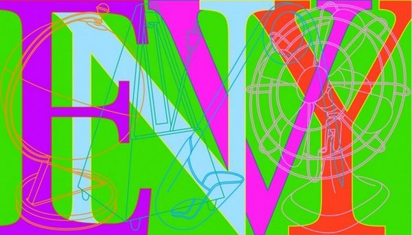 Curator: Michael Craig-Martin's "Sloth" presents a vibrant exploration of everyday objects, rendered in his signature bright, graphic style. Editor: Wow, my first thought is just how incredibly energetic it feels for something called "Sloth." The colors are so alive! Curator: The objects depicted, like a violin, a shoe and a fire extinguisher, seem almost superimposed onto the word "Sloth" itself, challenging our understanding of the concept. Editor: It's like the word is trying to contain all that visual energy, but it's bursting at the seams. It's almost ironic, in a playful way. Curator: Yes, and consider the cultural weight of these items—a violin evoking art, the fire extinguisher hinting at danger—all flattened into these bold outlines. Editor: It's a bit of a visual puzzle, isn't it? A reminder perhaps that even in supposed idleness, there's a world of associations swirling around us. Curator: Precisely, and Craig-Martin’s work reminds us of the stories objects carry. Editor: A very vibrant take on a rather lethargic concept, isn't it? A fun explosion of colors.