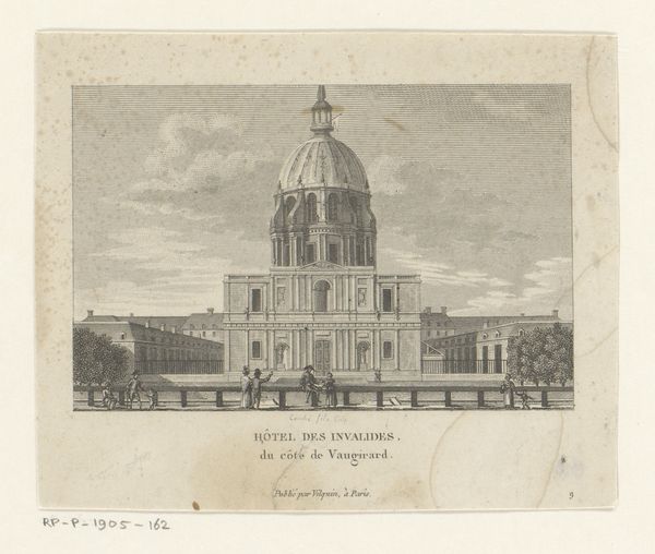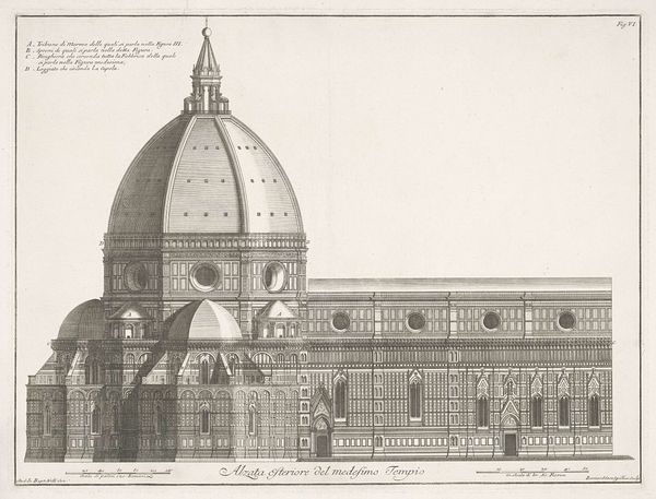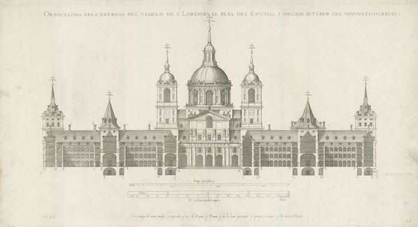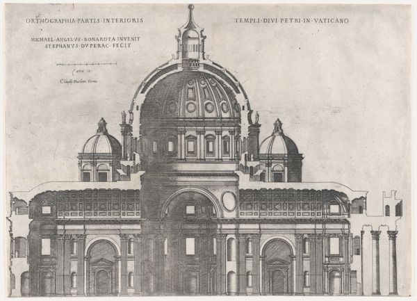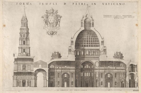 Curator: Before us is a fascinating architectural drawing attributed to Antonio da Labacco from the 1540s, showcasing Antonio da Sangallo the Younger's ambitious project for St. Peter's Basilica. The print depicts the façade, extending to the left with a prominent tower. Editor: My initial impression? A colossal geometric symphony. There’s a weightiness, a sense of permanence almost screaming from the page despite it only being a drawing. All those lines, it's like a city turned on its side. Curator: Precisely. Labacco, known for his precision, meticulously renders the architectural details, highlighting the geometric forms—the arches, the dome, and the repeated rectangular patterns that structure the façade. Note the landscape style typical of architectural elevations from that period, emphasizing the building's intended visual impact. Editor: The symmetry is impressive, bordering on obsessive. But the off-center tower is a bold move, wouldn’t you say? It injects a kind of playful disruption into the otherwise rigid formality. Feels very human. Curator: Indeed, the placement introduces a dynamic tension within the composition. But beyond that, consider the semiotic implications of the unexecuted plan. This represents an alternate trajectory, a "what if" scenario in architectural history. The colored ink wash drawing offers us a lens into the creative process, revealing choices made and discarded in the grand scheme of St. Peter's design. Editor: It is ghostly too. The fact that this grandiose design exists now only in print, frozen in ink. Think of all the artisans, the laborers, whose hands would never realize this particular vision in stone. There’s a poignant beauty in that unrealized potential. Curator: Your interpretation speaks to the temporal paradox inherent in architectural drawings. While intended to materialize in stone and mortar, they often exist as ephemeral projections of intention. The very notion of "form" as an enduring theme is challenged by the inherent mutability of architectural projects. Editor: Yes, and by freezing a moment of “becoming” versus “being,” Labacco's plan invites us to reimagine spaces and power itself. You know, maybe sometimes the best buildings are the ones that only exist on paper. They represent pure idea, unburdened by the constraints of reality. Curator: An intriguing counterpoint, reflecting on how formal elegance meets practical realities. This analysis has really deepened my understanding of this remarkable work! Editor: Couldn’t agree more! Sometimes you have to look a little off the page to truly "see" an artwork’s lasting power.