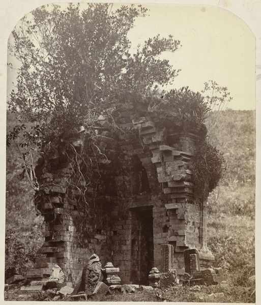 This albumen print entitled "Gezelschap bij de ruïne van het Kasteel van Coucy" was made by Delizy. Consider the social rituals of leisure in the late 19th century. Photography offered the burgeoning middle classes new ways to document their identities and experiences. This image captures a group amidst the ruins of the Château de Coucy, a site charged with historical significance. The castle, once a symbol of feudal power, was deliberately destroyed during the First World War, becoming a poignant symbol of loss. The act of photographing oneself within the ruins becomes an act of personal inscription into a broader narrative of history and cultural memory. What does it mean to perform leisure amongst the ruins of war? How do the sitters in this photograph connect to the histories of power, class and destruction represented by the castle? The sepia tones evoke nostalgia, but also a sense of distance from the events depicted. The figures, elegantly dressed, seem almost ghostly against the backdrop of decay. This photograph invites us to reflect on the layers of history embedded in a place and the emotional complexities of witnessing the past.