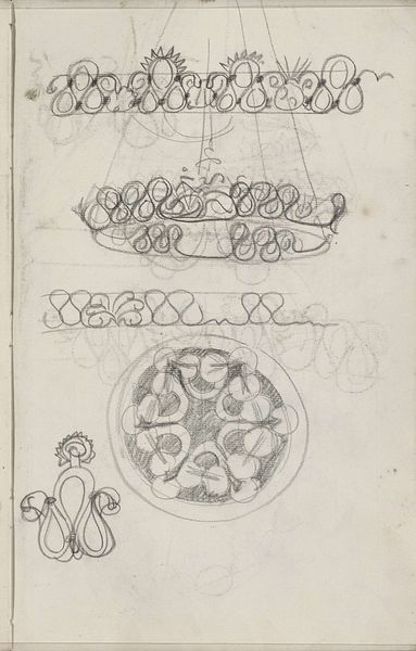 Curator: This intriguing page comes from the sketchbook of Carel Adolph Lion Cachet, dating back to around 1895. It is currently held in the Rijksmuseum. He rendered the drawing using a pencil. It appears to show different sketches and ornamentation ideas, possibly for a hanging lamp. What is your immediate take on this drawing, knowing its purpose was a design? Editor: It feels almost ghostly, doesn't it? Like catching a glimpse into the artist's subconscious. The overlapping lines and half-formed shapes give it this dreamy quality. And, you know, hanging lamps, chandeliers, they’re all about catching light and throwing shadows, which makes this medium so perfect to explore ideas. It feels so spontaneous, full of light but so transient. Curator: Indeed. Observe how Cachet uses a repetitive yet slightly varied motif – that elongated loop. This becomes the structural element, appearing in rows and circles, manipulated to form what we might identify as the basic "skeleton" of a potential lamp. Also, notice the geometry at play – how lines radiate outward, creating an architectural framework within the sketch itself. This reveals Cachet’s thought process, how he envisioned constructing three-dimensional objects from these preliminary strokes. Editor: Yeah, I get that! But for me, it's more about the feel of the piece. There's this real sense of flow and movement, the shapes undulate. It makes me think of seaweed gently swaying under water. Maybe, to give them light, there are suggestions of jellyfish! And the lack of shading makes it ethereal, almost otherworldly. Does this drawing hint at a feeling Cachet wanted the final object to embody, like calmness? I’m curious to explore it, perhaps like a meditation. Curator: It brings up questions on intention, certainly! What kind of light was he trying to capture or perhaps evoke? Cachet was known for his work in the Art Nouveau style, where organic forms and stylized ornamentation were a common motif. Editor: Absolutely. What seems simple turns out to be quite layered when you allow yourself the opportunity to dive into it, huh? Curator: Yes, precisely. Lion Cachet's design encourages one to consider the fundamental building blocks that contribute to art's more finished states. Editor: Yeah, seeing the beginnings always reveals the magical side. Makes you look with curiosity! Thanks for this conversation.
