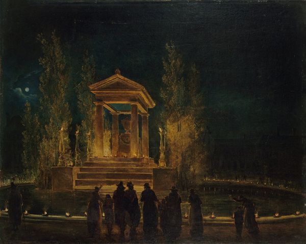Hans Makart created this oil on canvas, “Motiv aus dem Hellbrunner Schloßpark.” The painting is striking for its use of contrast. The dark, enveloping foreground creates a sense of enclosure, almost as if we are peering out from a hidden space. Then, the eye is immediately drawn to the bright, almost luminous depiction of what seems to be trees reflected in water. The composition is structured by the rhythm of vertical lines, possibly the columns of an arcade, which interrupt the watery scene. This division creates a dynamic interplay between opacity and reflection, reality and illusion. Makart uses a limited palette, primarily dark browns and vibrant yellows, which enhances the painting's dramatic effect. The texture appears rich, with visible brushstrokes adding depth and movement to the reflective surface. This contrast between the dark and the light, the solid and the fluid, invites viewers to contemplate the shifting nature of perception and representation.