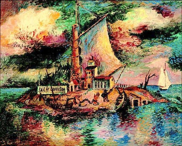 Curator: Before us is Paul Signac's "Lighthouse at Groix," created in 1925 using oil on canvas. What are your initial thoughts? Editor: It’s…dreamy. That pervasive pointillist technique gives the scene this hazy, almost ethereal quality. There’s something romantic about how the light catches on everything. Curator: Indeed. Note how Signac employs divisionism to break down light and color into discrete dots. This compositional structure, seemingly chaotic up close, resolves into cohesive forms from a distance. Editor: Absolutely, and consider what a lighthouse symbolizes. Beyond navigation, it is safety and guidance—hope amidst stormy seas, you might say. These little boats under the watch of the lighthouse have almost a metaphorical layer for me, don’t you think? Curator: Symbolism is, of course, pervasive, and Signac's adherence to a regulated application of color serves not to obfuscate but to enhance clarity in his chosen representational field. Editor: Yet it does feel quite optimistic, though, even with the heavy symbolism—the almost joyful way those colours play across the water and sky makes it all feel incredibly light. Curator: That juxtaposition is intrinsic. Notice the almost geometric placement of those vertical masts against the softer sky, the calculated use of complementary colours, which amplify one another in the visual field... Editor: It's that contrast between geometric rigidity and the gentle brushstrokes that perhaps communicates Signac’s deeper sense of optimism, don’t you agree? Curator: The beauty of Signac is in this very interplay: the fusion of the rational with the purely sensory, which encapsulates the symbolic complexity of the coastal vista. Editor: So, in Signac’s hands, the Lighthouse is not just a beacon, but a mirror of humanity itself – our need for structure, tempered with an unwavering pursuit of hope. Curator: Precisely; his controlled approach invites viewers into a contemplative relationship with the very fabric of vision and representation. Editor: An illuminating insight—thank you.
