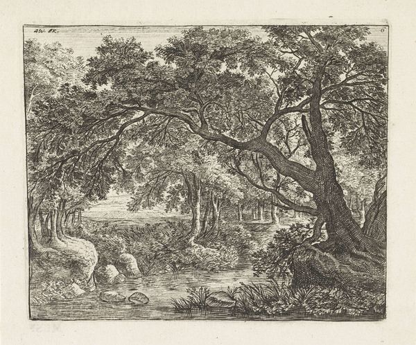 Curator: The first thing I notice is this delicate rendering, achieved through engraving on a plate. Editor: It feels so peaceful, almost idyllic. There's a comforting simplicity in the arrangement. Curator: Indeed. This is Pierre Joseph Jacques Tiberghien's "Landschap met bomen op de voorgrond" which roughly translates to "Landscape with Trees in the Foreground" from 1786. It’s a fine example of the Romantic movement’s fascination with nature. Editor: What role did imagery like this play in its period? Was this idealized or part of some other discussion in France at the time? Curator: That’s a critical question! Consider that engravings like this served both aesthetic and, crucially, documentary purposes before photography. Landscapes, especially idealized ones, reinforced cultural ideals and notions of national identity in Revolutionary France, but at the same time, one can notice through the very line-based quality of the etching a turn away from traditional classical artistic values towards a less hierarchical engagement. Editor: So, almost a deliberate democratization of imagery? Curator: Precisely. The figure leading the herd feels integral but not dominant, equally part of a greater narrative with the water, landscape, and looming sky in the back of the scene, all under the same etched sky. It creates a more inclusive, less hierarchical image of humanity. Editor: It does evoke a sense of place and daily life of that time. Curator: The composition really invites the viewer into the scene, almost to participate in the daily rituals. The artist invites us in as witnesses, almost to a pastoral existence. Editor: Well, for me, reflecting on Tiberghien's world building, this work reminds me of how landscape itself has become so charged with political meaning now. The ability to see places as intrinsically linked to political discourses can be powerful. Curator: For me, this work also reveals how long-standing symbols of stability have remained so crucial to conceptions of European identities, as the imagery shows, a dialogue as pertinent today as in Tiberghien's time.