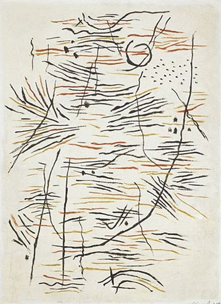 Editor: So this is Gary Hume's "Water Painting" from 1999, done with acrylic paint. It strikes me as both chaotic and serene, somehow. All those looping white lines against the solid yellow background… it’s a little unnerving. How do you interpret this work? Curator: The looping lines, particularly depicting the human form, carry echoes of ancient Greek vase painting, don't they? Those stylized figures, forever captured in motion… yet here, the motion is frenetic, multiplied. The "water" might not be literal; perhaps it represents a flowing subconscious, a constant shifting of identity. Does it resonate with contemporary ideas of fragmented selves in the digital age? Editor: I see what you mean! The repetition definitely adds to that feeling. And the simplification, almost like a child’s drawing…is there a cultural reference there too? Curator: The naivety, juxtaposed with the classical allusions, presents a powerful tension. It reminds me of how indigenous cultures often incorporate traditional symbolism into modern art, creating a dialogue between the past and present, a constant re-evaluation of cultural memory. Is Hume perhaps inviting us to reconsider how we view the body, representation, and time itself? Editor: That’s fascinating, I hadn’t considered that level of complexity. So it's not just a nude, but also an exploration of cultural inheritance? Curator: Precisely! Symbols accumulate meaning across generations. Consider the implications of the artist’s choices here – the colour, the form, the style. What is being preserved, and what is being deliberately obscured or challenged? Editor: I definitely have a different perspective now! Thanks for helping me look beyond the surface. Curator: And thank you for bringing fresh eyes. It’s always rewarding to revisit familiar works through a new lens.