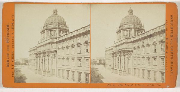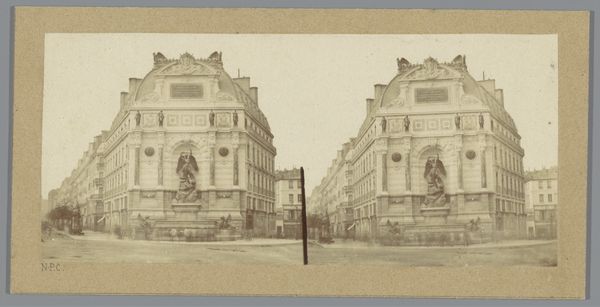 Curator: I'm struck by the geometry, how the verticality of the columns plays against the long horizontal facade. The light also brings out so many variations in texture across its surface. Editor: This is a fascinating cityscape capturing the Nationale Bank building on Wildewoudstraat in Brussels. Jules Hippolyte Qu\u00e9val took this photograph between 1866 and 1870. This piece exemplifies the Neoclassical style and skillfully uses photography and printmaking, incorporating a daguerreotype print as its base. Curator: A daguerreotype, you say? Considering the laborious process and the limitations of early photography, the precision achieved here is remarkable. Think about the urban development underway at that time. This bank was not just a building; it symbolized capital, labor, and the industrial advancements of the era. Editor: Indeed. And it is interesting to consider how the mechanical reproducibility of this medium changed artistic perceptions and practice. Here, photography enters into a direct dialogue with Neoclassical architectural principles. The print offers multiple opportunities for engagement; each impression creates new meaning through circulation and context. Curator: The even lighting and detailed surfaces present the building with objectivity but the composition does elevate its grandeur. It becomes not just a structure but an ideal – of stability, permanence, of economic power. Editor: Right. By emphasizing classical motifs—columns, statues, symmetrical design—the building reinforces ideas of historical continuity and stability, critical in the rapidly changing world of mid-19th century Brussels. I also notice the way the shadows extend along the street, as if to hint that commerce pervades every aspect of city life. Curator: This dialogue between form and social function offers some striking parallels that can tell us a lot about labor practices and social hierarchy, even through something that appears initially just a stoic photograph of a building. Editor: Agreed. Examining this piece with a sensitivity to how material informs message grants us rich understandings about history and human creativity.