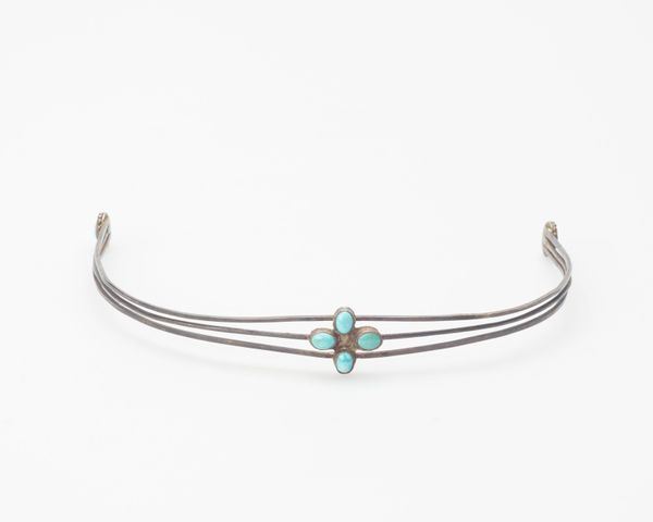Curator: The simplicity of form is quite striking, isn’t it? Before us, we have an exquisite silver hat band, currently held in the collection of the Minneapolis Institute of Art. The date of its creation is unfortunately unknown. Editor: It appears worn, loved almost, and the cool tones of the metal and interspersed turquoise give it an unexpectedly serene feel. It looks to be Indigenous American. Curator: Absolutely. These types of accessories often served as status symbols but also as a way to express tribal or clan affiliations. The turquoise, of course, would have carried significant spiritual weight for many Indigenous cultures. Wearing it close, especially on the head, can suggest the wearer sought mental clarity or protection. Editor: Observe how the cool-toned silver and turquoise perfectly offset each other. It looks hand-wrought. See those incised linear elements etched onto the metal; how would you characterize their arrangement and repetition? Curator: Precisely. Beyond adornment, it prompts considerations around power structures, specifically, how marginalized communities utilized art forms, like metalworking here, to assert identities amid societal pressures. Was the creation of adornments and fashion such as this, in and of itself, an act of resistance? A visual declaration? Editor: A potent visual declaration, I would agree! What do the shapes suggest to you, beyond just their purely aesthetic function? The repeated zigzags almost read like mountain ranges, perhaps landscapes abstracted to the point of pure design. Curator: They could also signify narratives—stories etched into silver that speak to migrations, origins, beliefs. The use of turquoise is also very intriguing. It speaks to a relationship with the environment and a reverence for resources deemed sacred. This wasn't merely a band for a hat; it was imbued with layers of cultural meanings. Editor: Fascinating how its cool, polished surface seems to both reflect light and absorb meaning, wouldn’t you agree? What was originally utilitarian has certainly transcended its initial role to now function as something else altogether! Curator: Yes, exactly. Studying pieces like this calls us to question not just what we see, but whose stories are interwoven into the threads of art history and the present-day echoes of colonial practices. It reminds us to view adornment beyond ornamentation, locating them in very powerful sites of identity formation. Editor: A valuable encounter.