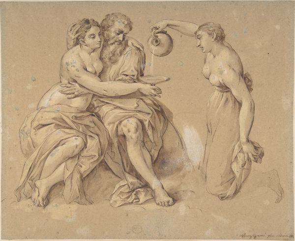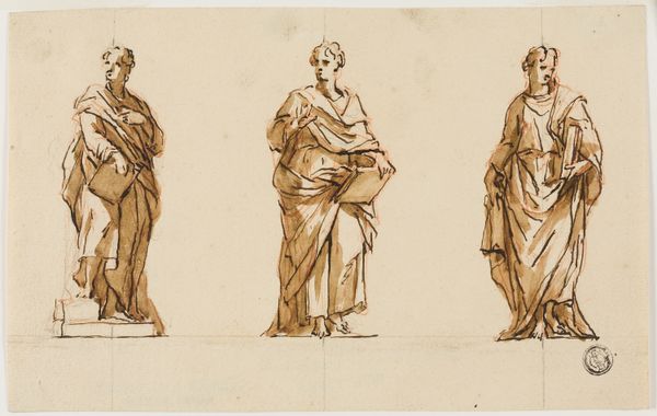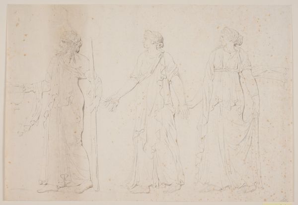 Curator: What immediately strikes me is the incredible detail achieved with what seems to be a limited palette. It's very subtle and elegant. Editor: Agreed. And we're looking at Thomas Stothard's "Three Muses (recto); Study of Knight and Monk for an Illustration in a Gothic Novel (verso)". It's undated, residing here at the Art Institute of Chicago. What you see predominantly is pen, pencil and graphite ink on paper. It feels so classical. Curator: Indeed, the composition clearly echoes classical ideals. We have three female figures, likely the muses, draped in flowing robes, each seemingly representing a different aspect of the arts. One holds a lyre, another a theatrical mask. I can't help but see echoes of the social function of artistic creation here, the very act of producing art for patrons. What were Stothard's own ties to aristocratic and bourgeois patrons who shaped the environment where these images could flourish? Editor: Well, before delving too deeply, do you feel that mask suggests a deeper, perhaps theatrical meaning beyond mere performance? Perhaps a veiled commentary on artifice? Curator: I think so, absolutely. Theatre and the mask certainly bring forth a performative element, perhaps the way artists mediate between realities. Stothard seemed to circulate printed images for a broad consumer market, tapping into trends for book illustration and popular print culture of the time, and his prolificacy suggests he's balancing artistic vision and mass appeal. What processes allowed the dissemination of his images across different publics? Editor: I see a continuity with classical ideas and myth. Think about the roles the muses embody—poetry, music, drama. These images capture the Western canon's foundational narratives about creative inspiration. That theatrical mask whispers about both tragedy and comedy, the full spectrum of human experience rendered symbolic. Curator: The verso of the drawing reveals another set of subjects altogether though, knights and monks from a Gothic novel. These are figures rooted in romance. Editor: I appreciate the balance here – the refined elegance of the muses and the gothic grittiness from the opposite page. They pull on entirely different threads of our collective imaginations. Curator: A real intersection of craft, commodity, and cultural values embodied in these simple sketches, isn't it? It highlights Stothard's dexterity within London's competitive print market. Editor: The symbols he deploys resonate even now. Thanks for guiding us into new paths, that was truly enlightening.