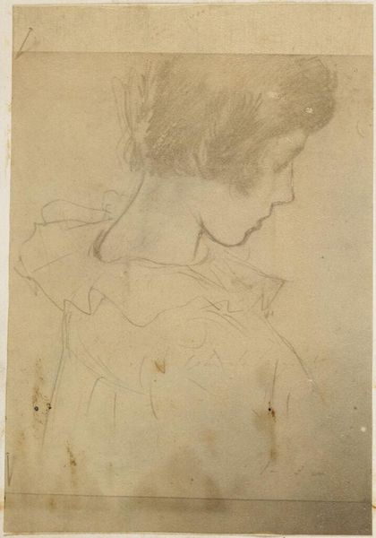 Editor: This is Jean-Charles Cazin’s "Profile Portrait of a Girl," done in pencil. The stark contrast between the shadowed face and the lighter background creates a striking effect. What do you see in the composition itself? Curator: I am struck by the economy of line. Cazin has used the barest of strokes to render form. Note the subtle modulation of tone achieved purely through hatching and cross-hatching. Editor: So the shading is key to understanding the portrait’s form? Curator: Precisely. The contrast not only defines the girl’s features but also imparts a sense of depth and volume. Consider how the line quality varies, thick and assertive in places, then almost dissolving into the paper elsewhere. Editor: I hadn't noticed the variations in the lines before. It’s amazing how much information he conveys with so few marks. Curator: Indeed. Cazin’s mastery lies in this reduction, revealing the essence of form through purely formal means. Editor: I'll definitely pay more attention to line quality in drawings now.