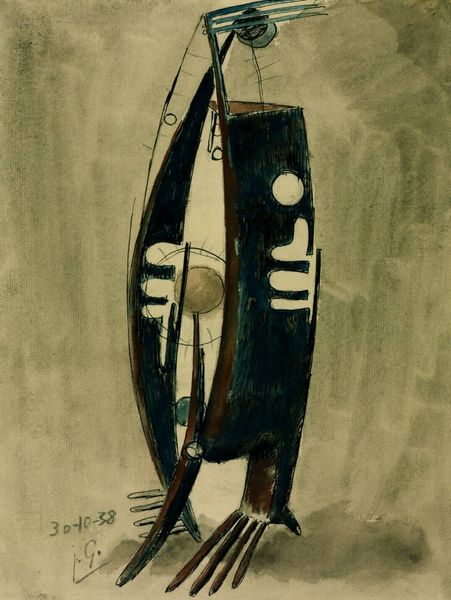 Curator: Looking at Miró’s "Femme, oiseau" from 1977, I'm immediately struck by the dreamlike quality of the work. It's as if it's emerged directly from the subconscious. What are your first impressions? Editor: Hmm, "dreamlike" is spot-on. It's playful, almost childlike, but with this lurking…what shall I call it…uncertainty. The colours are muted—the pastel blue of the background especially contributes to that mood. It's unsettling and charming all at once, which is quite the feat, wouldn't you say? Curator: Absolutely. The simplicity of line and form juxtaposed with the inherent strangeness of the imagery is signature Miró. I mean, we see here the geometric form of a person underneath what is apparently a bird – but the bird looks almost threatening hovering above. He used watercolor, ink, and pastel on paper to create this. Editor: Threatening is such a loaded word. But I see what you mean – I guess what throws me is the inky darkness of that bird contrasted to everything else. Where would you situate this stylistically within Miró's broader career? Curator: Good question. It's interesting because by 1977, Miró had fully embraced this simplified, almost calligraphic style. We see echoes of surrealism, of course, with the biomorphic forms and the juxtaposition of disparate elements. But also the visual style shows signs of Modernism's interest in flat perspective, line and the basic shapes of form, if you see what I mean. This feels later-stage Miró—assured, confident. Less concerned with representing the external world than exploring the internal landscape. What purpose do you believe art such as this serves the public today? Editor: Well, beyond aesthetic pleasure – because it *is* beautiful – it challenges us. It asks us to confront ambiguity and find meaning where there isn't necessarily a readily available narrative. It disrupts our expectations of how the world should be represented, which, in a society increasingly driven by image manipulation and political posturing, is profoundly important. I also see a connection to outsider art and I believe work that does not come from an "official" art education teaches us much today. Curator: I agree wholeheartedly. It’s an invitation to explore our own inner worlds. What do we think of when we see this “woman, bird?” Maybe a mother protecting her child? Maybe something more complex? . Editor: Yes! Maybe the woman is releasing the bird—sending a message of hope in these increasingly bleak political times. Art invites this—a collaboration, ultimately, between artist and audience. Curator: Precisely. Miró gives us the space, and the tools, to do just that.