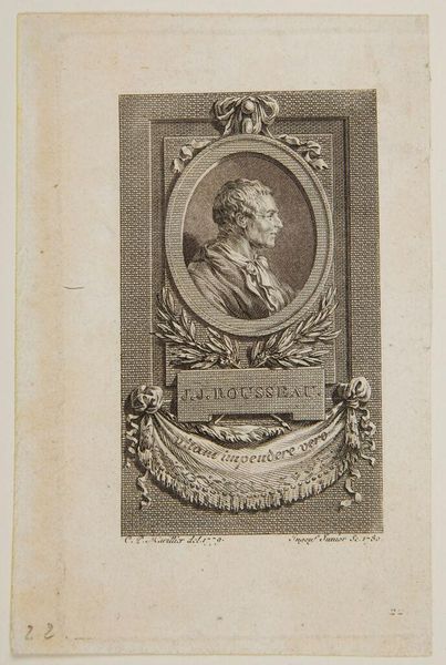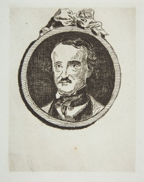 Editor: This is Édouard Manet's small etching of Edgar Allan Poe, currently housed at the Harvard Art Museums. I find the circular frame around Poe's portrait quite striking. What symbols do you see embedded in this image? Curator: The circle itself is a powerful symbol, representing wholeness and eternity. Do you notice how Poe is placed within it, almost enshrined? The wreath above suggests honor, but also perhaps a somber acknowledgement of his tragic life. Editor: That's a fascinating observation! I hadn't considered the somber aspect of the wreath. Thanks for sharing! Curator: And thank you for seeing beyond the surface! It’s in these visual layers that we find enduring meaning.