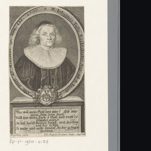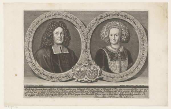 Curator: Today, we're looking at a 1668 engraving by Johann Caspar Hoeckner, titled "Portret van Martin Geier op 54-jarige leeftijd en vier verbeelde psalmen," currently held at the Rijksmuseum. Editor: My initial impression is one of complexity. The stark contrasts typical of engraving, combined with the density of symbolic elements, creates a rather intense visual experience. Curator: The composition is divided. On the left, we have the portrait of Martin Geier himself, framed within an elaborate oval. Note the meticulous detail in rendering his features, the texture of his garments. And the flanking imagery of the skull and cross—typical vanitas. Editor: Right. But observe how the engraving itself necessitates a particular working method. The labour involved in producing those fine lines—the physicality of the process—resonates. It's not just about representation; it's about the tangible effort embedded within the matrix, literally pressed upon the paper. Curator: Absolutely, the technique is integral to understanding the piece, informing our perception. And if we turn our attention to the right, we see four scenes illustrating psalms of David. Editor: It’s interesting that Hoeckner embeds another image of a printing press into these biblical narratives. It draws connections between textual production and artistic process, showing the craft involved in disseminating not only holy scriptures, but also art and thought. It serves as a clear, visual reminder of material origins and social impact. Curator: Indeed. It’s as if Hoeckner is deliberately conflating the spiritual with the scholarly and the act of creation, presenting us with multiple layers of meaning. One must decode each symbol, and assess its purpose in conjunction with those around it. Editor: I find the stark juxtaposition between the individual portrait and these visual renderings particularly thought-provoking. It makes me consider print production beyond mere aesthetic appreciation, instead asking fundamental questions of purpose and reception within 17th-century networks of knowledge. Curator: A most valuable insight. I trust listeners have now been equipped to decode Hoeckner’s symbolic portrait with renewed engagement. Editor: A renewed and informed appreciation for what images make possible.