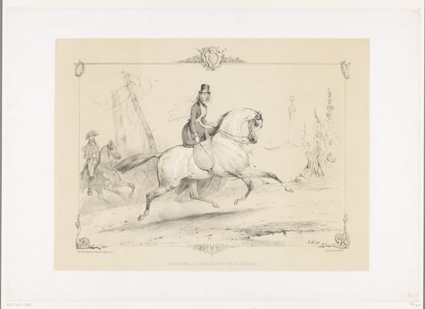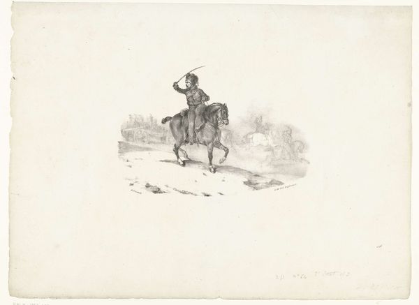 Editor: This is "Lansier te paard in de sneeuw," a pencil drawing by Nicolas Toussaint Charlet, created in 1834. I’m struck by how delicate it feels, given the subject matter – a lancer on horseback in the snow. There's almost a ghostly quality to it. What catches your eye when you look at this piece? Curator: Oh, "ghostly" is spot on! For me, it's the feeling of transience captured in the unforgiving landscape. Charlet wasn't just depicting a soldier; he was hinting at the vulnerability beneath the uniform. Notice the dog trotting along – almost comically earnest. Do you think Charlet included it for a bit of levity, or something more? Editor: I hadn't really focused on the dog! Maybe both? It lightens the mood a little, but also maybe emphasizes the soldier's isolation even further – his only companion is his dog. Curator: Exactly! And think about the date – 1834. The Napoleonic era, with all its heroic grandeur and brutal realities, was still a very recent memory. This drawing isn't a celebration of war, is it? It feels more like a quiet contemplation of its human cost. Editor: Definitely not celebratory. Now that you mention the historical context, I see the work's nuance much more clearly. It’s about endurance, not victory. I appreciate how the landscape informs the human element of the painting. Curator: See how a simple pencil sketch can hold such depth? The beauty, I find, lies in those unspoken stories. Editor: Thanks, I learned a lot about the narrative of that period through art. Curator: My pleasure. Always dig deeper, and let your intuition guide you!