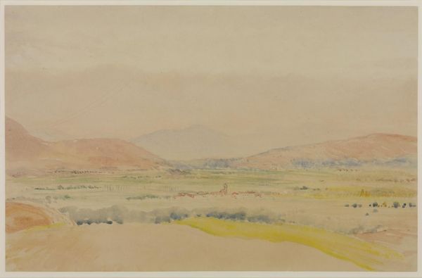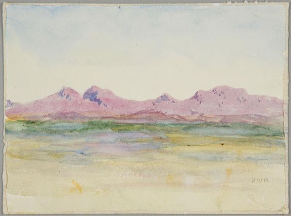 Curator: Let's look at Denman Waldo Ross's "Landscape with Mountains," a watercolor piece located here at Harvard Art Museums. Editor: Immediately, I'm struck by the watercolor's looseness, almost as if the mountains and landscape are dissolving into the atmosphere. Curator: Indeed. The fluid application suggests a specific kind of labor and consumption of materials, moving away from the rigid academic landscape traditions. Notice the almost casual strokes. Editor: I feel a sense of transience—like a fleeting moment captured. The pink hues on the mountains feel like a memory. Curator: Perhaps reflecting an increased interest in the availability of manufactured pigments, allowing for such nuanced color variations. Editor: For me, this little artwork evokes an entire world, seen through the soft lens of a personal experience. Curator: The materials themselves, the watercolor and paper, point to a democratization of art production—a shift towards more accessible means of creation. Editor: Ultimately, though, it’s the emotional resonance, that wistful feeling, that stays with me. Curator: And for me, it's about recognizing how the art world was evolving toward greater accessibility in materiality.