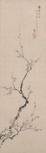 Editor: This is *Blossoming Plum Branch*, an anonymous painting. I’m struck by the simplicity of the composition. How do you interpret the imagery and its historical context? Curator: Well, consider the plum blossom's symbolic weight in East Asian art. It often represents resilience and renewal. How might the anonymity of the artist play into its broader cultural reception? Editor: I suppose the focus shifts from individual expression to a shared cultural value. Does that make this piece less about the artist and more about the society consuming it? Curator: Precisely! It becomes a reflection of collective ideals, a visual embodiment of shared beliefs circulating within a society, and perhaps a symbol of cultural identity. Editor: That’s fascinating! I never thought about how anonymity could enhance the cultural significance. Curator: Indeed, and it shows how art institutions and cultural values shape our understanding.