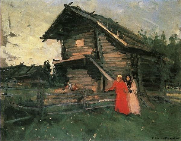 Editor: Right now, we're looking at Konstantin Korovin's "Yard", painted in 1904. It's this hazy scene rendered in oil paint. It strikes me as simultaneously peaceful and gloomy – what catches your eye when you look at this piece? Curator: Well, I'm immediately transported back to summers at my grandmother's. Korovin captures a very particular, almost nostalgic atmosphere. Notice how the light flickers and dances across the wooden structures? It is that impasto, thick brushwork, which feels as though the memories are textured into the canvas itself, layer upon layer. Does it give you a sense of a fleeting moment captured in time? Editor: Definitely! The way the brushstrokes are so visible, it's like you can almost feel the artist's hand moving across the canvas. How does that connect to the broader Impressionist movement? Curator: Ah, good question! It's Impressionism at its heart. Think about it: Monet and Renoir were capturing light's ephemeral qualities. Korovin is doing something similar here, focusing not just on the subject of a yard, but the feeling *of* a yard, and how the yard lives and breaths with those who work in it, perhaps. Does that make sense? Editor: Absolutely, the way you describe the “feeling of a yard”, not only what you can see. It makes me appreciate the genre-painting elements even more. The artist invites you to reflect on this everyday moment. I guess I saw the surface-level gloom, and missed some of the subtle things happening. Curator: Precisely! Art often reflects more than meets the eye initially, inviting you on a journey of shared, lived moments through light and texture, does it not? Editor: Yes. I'll never look at a painting of a yard the same way again. Thank you!