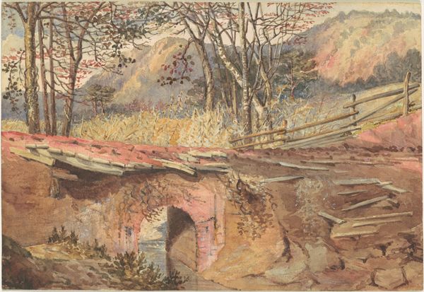 Editor: So, here we have "Flußtal mit felsigem Ufer, im Hintergrund Gebirge," a watercolor and graphite drawing made around 1801 by Georg Melchior Kraus. There's such a sense of stillness and tranquility in this landscape. What stands out to you? Curator: I'm drawn to the ways in which this seemingly serene landscape intersects with the social and political undercurrents of its time. Consider the Enlightenment ideals of Kraus' era and how the relationship between humanity and nature was being re-imagined. What kind of power structures do you see reflected, or perhaps challenged, within the composition? Editor: I guess the small size of the figures could indicate that humanity is inferior to nature? Curator: Exactly! And think about who had the privilege to contemplate such idealized landscapes. Was this vision accessible to all, or was it largely the domain of the elite? Moreover, during this period, landscape art served to reinforce ideas about nationhood. Do you see elements in this drawing that contribute to a particular understanding of German identity? Editor: That’s fascinating. I hadn’t thought about it in terms of national identity, but I see how the romanticization of the German landscape could foster a sense of cultural unity and pride. It definitely feels like this landscape isn't simply 'nature' - but more an idea of it, or even propaganda about it. Curator: Precisely! Consider, too, how women, especially female artists, navigated and were often excluded from these landscape traditions. Editor: So, beneath the beauty, there's a lot to unpack about class, gender and power. This art is political even if it doesn't look that way at first glance. Curator: Indeed! It challenges us to see art not as separate from society, but woven into its very fabric.