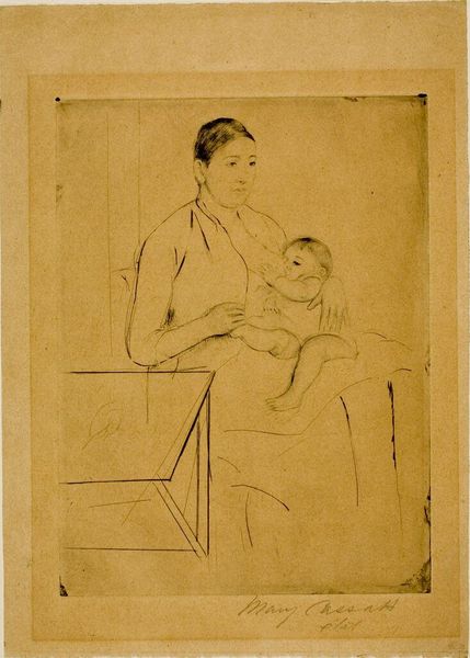 Curator: Mary Cassatt's "The Caress," held here at the Harvard Art Museums, is a delicate print rendering of a mother and child. It strikes me as both intimate and remarkably modern in its simplicity. Editor: The etching process itself is part of the subject, isn't it? Consider the labor involved in producing multiple impressions, making motherhood a commodity for wider consumption. Curator: Indeed, and the way she employs the etched line is fascinating; notice how the bare minimum of strokes effectively conveys depth and shadow. Editor: But even those lines speak to gendered labor, reflecting the controlled production of images for bourgeois homes—art as domestic adornment. Curator: I see it more as Cassatt pushing the boundaries of printmaking, elevating it to a fine art while exploring the complex emotional bond between mother and child. Editor: Perhaps. But the commodification of intimate moments like this also helped shape societal expectations around motherhood in the late 19th century. Curator: It’s a compelling idea, and one this deceptively simple print makes all the richer. Editor: Yes, it certainly leaves one with much to consider.