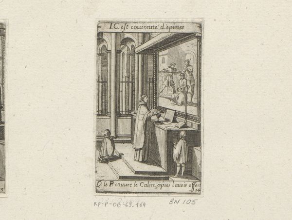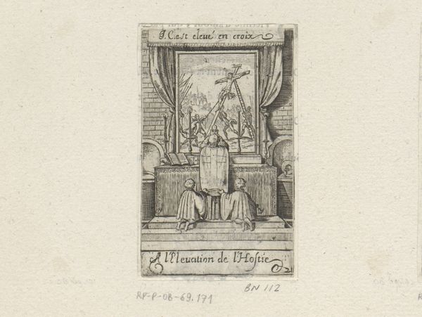Editor: This is "Priest with Two Altar Boys Before an Altar," an etching by Sébastien Leclerc I from 1661. It’s housed in the Rijksmuseum. It's very detailed despite its small scale, but I'm curious about what all the different elements mean. What do you see in this piece? Curator: The most compelling aspect of this image lies in the symbolic weight of its composition, it’s not merely a depiction of a religious scene. Look at how the banner text divides the image in two, each half presenting an inverse image or shadow of each other. Editor: What do you mean by "inverse image?" Curator: The image presents two contrasting episodes in parallel: the priest officiating the Gospel on earth at the lower half and the image from the Gospel he reads: Christ accused before Pilate, at the top half. Editor: Oh, I see. So the religious ritual reenacts the gospel events in some way? Curator: Precisely. The scene becomes a layered visual symbol where each element reinforces the continuity of faith and memory, asking us to consider the repetition of symbolic gestures. Note how even the physical elevation from lower level to upper echoes and amplifies such dynamic. Editor: So it’s not just about what’s literally depicted, but what it represents, the layers of meaning? Curator: Absolutely. It reveals how visual symbols function to perpetuate meaning across time. By creating patterns Leclerc reveals deep historical and psychological dimensions. Editor: That makes me see it in a totally different way. It’s like the image is building up connections between then and now, past and present! Thanks for helping me notice how art builds these enduring connections through symbols.