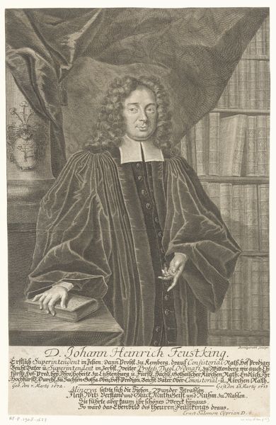 Curator: This is a portrait of Gottfried Thomasius, created between 1727 and 1746 by Valentin Daniel Preissler. It's rendered using a combination of pen, charcoal, and intaglio on paper. Editor: Immediately, I'm struck by the formality and staged nature of the piece. The severe pose, combined with the almost theatrical lighting, really places Thomasius within a very specific social and intellectual framework. Curator: Exactly. Let’s consider Preissler's method. The labor invested in achieving such fine details with pen, charcoal and intaglio—the way he carefully constructed textures on the paper— speaks to the importance of skilled craftsmanship within the Baroque era. There’s an interplay of handmade versus reproductive quality, since intaglio allows for printmaking. How would this impact his reach to his audience? Editor: Absolutely. And if we look closer, who *is* Thomasius and what statement is being made here? The prominent book he holds speaks to the growing culture of scholarship and print media’s role in disseminating knowledge during the period. The background reinforces this identity; note the implied access to vast libraries. Thomasius's elevated status can be contextualized with broader access to education for bourgeois citizens in the Early Modern era. Curator: Preissler isn’t merely depicting him. Consider the precise pressure of the pen strokes to render the subject's clothing: the expensive fabric, buttons, elaborate cuffs… Each aspect deliberately indicates social standing. He's manufacturing a very particular image of a prominent intellectual for public consumption, showing that portraits, engravings or any form of visual culture can produce hierarchical roles. Editor: That brings up an interesting point about the artist's role, too. Who commissioned this piece and why? Considering that printed intaglio engravings could be circulated broadly, there’s clearly an intended audience and message embedded in this representation of learned status and access to knowledge. This creates a cultural authority—we see these repeated even in modern forms of self-presentation. Curator: Ultimately, this portrait serves as a record of production practices prevalent in the Baroque period, evidencing a keen interest in social stratification and material wealth within artistic representations. Editor: Agreed. Understanding that representation helps us deconstruct visual power dynamics that are, frankly, still circulating today.