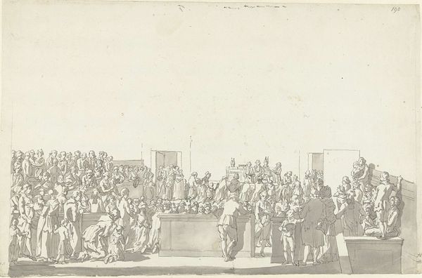 Curator: Today, we're examining "Koning Willem I geeft dank voor de hulp verleend aan de slachtoffers van de watersnood van 1826," an engraving from 1829 by Jean-Louis Van Hemelryck. Editor: The composition feels strikingly staged, almost theatrical. There is a definite emphasis on verticality through the throne. Curator: Absolutely. Consider how the engraving technique uses distinct hatching and cross-hatching to model form and convey the textures of cloth, skin, and even the weight of the regal attire. It's an impressive feat of control. The hierarchy created via the height of the king also alludes to concepts of divine rule. Editor: I’m struck by the visual symbolism surrounding King Willem I. He’s presented elevated on a throne, in military garb, conveying power. However, there is a softening gesture—an apparent moment of gratitude toward the populace behind him. One can imagine this ruler cares for their people through the visual symbol of charitable distribution, especially considering the piece's inscription which references generosity and the alleviation of distress. Curator: Yes, notice how Van Hemelryck uses the contrast between the darkness and light to literally elevate Willem, casting him in a favorable spotlight while literally darkening the scene around the people. There is great control and skill used in service of idealization here. Editor: The figure is absolutely idealized. He sits high above his countrymen in a kind of pantheon of benevolence, recalling older symbols of statecraft such as that of a royal benefactor or an allegory of charity. Yet the composition almost looks anxious and unnatural given that one may wonder what events actually occurred during this 'moment'. Curator: That tension is exactly what the Romantics were after, trying to instill a sense of heightened feeling and drama, despite being grounded in documented historical happenings. Editor: This reading changes my perspective. Thinking about visual texture and symbolic associations simultaneously shows the capacity for potent cultural encoding via formal elements. Curator: Indeed, and by attending to both the composition and symbolic elements, we reveal its complexities as both art and cultural artifact.