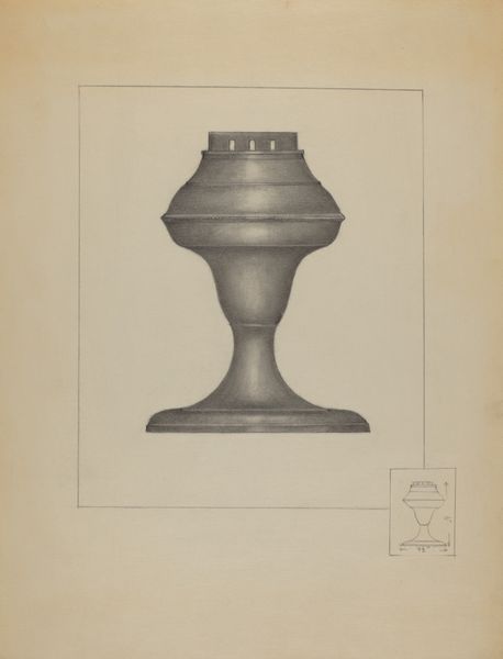 Editor: This is Henry Meyers’ "Pewter Lamp," created around 1936. It's a pencil drawing, and what strikes me most is the almost clinical precision, yet it still feels quite elegant. What can you tell me about this drawing? Curator: Indeed. The precision you observe points us towards the social contexts of the period. Think of the 1930s: economic depression, and a drive for efficiency. This rendering, in its attention to detail, may reflect the need of functional design to support those contexts. Is this lamp merely decorative or for something more? Editor: It looks like it could be for a ritualistic purpose, with that chalice-like form. Or is that reading too much into it? Curator: Not necessarily! Even everyday objects carry cultural weight. What rituals, whether secular or sacred, might this lamp facilitate? Considering this, what statement, whether intended or not, do you believe the artist makes about the role of rituals during times of economic depression? Is this accessible or alienating to the broader public? Editor: So it is less about the object itself and more about the societal currents shaping its creation and function... That definitely changes how I view the work. It becomes more about the people and their needs, and how the artist interprets and presents those elements. Curator: Exactly! And perhaps a reflection on the availability of basic needs and the cultural and spiritual needs of a community. This allows us to investigate intersections of art, design, and the societal forces that frame them. I appreciate your willingness to think through this with me. Editor: I agree! Thinking about its societal function gives this artwork even more layers. Thanks so much for that new perspective!