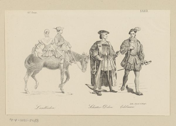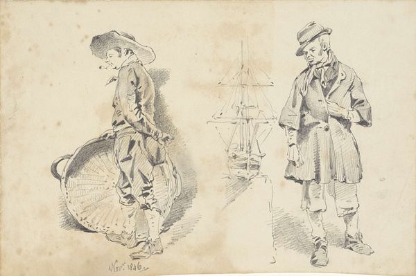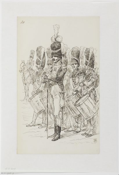 Curator: We’re looking at “Militairen met een trommel en blaasinstrumenten,” or “Soldiers with a Drum and Wind Instruments,” a drawing by Jan Hoynck van Papendrecht dating back to before 1889. It's ink on paper and displays three figures in military dress. My initial impression is one of detailed observation and restrained energy. Editor: It’s interesting how Papendrecht focuses on rendering the specific qualities of the uniforms— the fabric, the buttons, and how they fall on the body. Curator: Yes, but look closer, isn't the work primarily about documentation? The artist meticulously recorded these men in their work attire and weaponry for reasons we can only surmise. The work reminds us of military presence and perhaps alludes to how these individuals operated in a time of considerable conflict, given their formal uniforms. Editor: But there’s an artistry beyond simple record-keeping, isn't there? Observe how he plays with line weight. In the figure on the right, for instance, those densely packed lines create a stark contrast. It’s more than just representation; it's manipulation of form to create an impactful visual experience. The composition directs the eye. Curator: I would venture it's more that Papendrecht seems keen to preserve not only the uniforms' precise construction, as you've alluded, but what those uniforms stood for socially, which speaks to this historical fashion. Also the role of the musicians themselves, who perhaps represent celebration but also potentially represent mobilization for war. Editor: Do you feel the work suffers by being a preparatory drawing and nothing more, as far as we know? Are these figures less impactful as components than had they been scaled into a final piece? Curator: I'd argue its preparatory status is precisely where the drawing's value rests. We gain access to Papendrecht’s artistic process, revealing how these materials and practices are intertwined with military culture. Editor: True. The raw, unpolished quality does invite us to look past the figures and examine the craftsmanship. Curator: Precisely. In that sense, maybe there is more value to its "unfinishedness." Editor: An insightful suggestion, I’m almost persuaded.