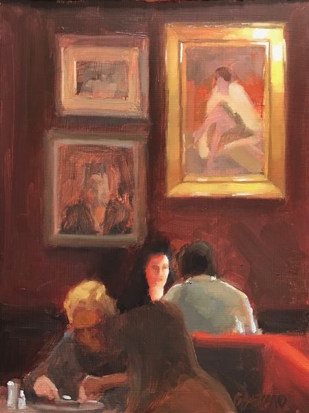 Curator: What catches my eye first in Dan Graziano’s “Dinner at Le Chat Noir” is the overall warmth. It’s bathed in these beautiful oranges and reds that speak to the intimacy of a shared meal, perhaps a whispered secret. Editor: I’m drawn to the sheer layering of it, the way the paint is worked. It’s so immediate and evocative, especially observing how Graziano captures the fabric of the waiter's apron, the almost crude texture implying its materiality and perhaps even the repetitious labour involved. Curator: Exactly! The looseness adds to the feeling of a fleeting moment. Look how he captures the light glancing off the glassware on the tables, little sparks of conversation mirrored in the physical objects. The famous "Le Chat Noir" poster hangs in the back there too - subtle! A nice tongue in cheek reference by Graziano. I almost feel I can hear the murmur of voices, the clinking of cutlery. Editor: It makes you consider the social context, doesn’t it? Cafes have always been a hub, particularly in a city environment. The material fact of the cafe space, then and now, allows this specific mode of interaction, from the table setting down to the print hanging in the back. Curator: And I think Graziano taps into that beautifully. There's a melancholic beauty to it, wouldn't you agree? It isn't just the place, but also the feeling of togetherness and transience… We're here, now, but the moment slips away as we look at it. It asks about more than what meets the eye - it questions who belongs here. What does it mean to be here, right now? Editor: Precisely. It is a genre painting of sorts but a challenge, because where "high" art so often avoids a blatant, obvious awareness of its making, pieces such as this instead allow viewers to access its materiality as a starting point, thereby becoming open to all those wonderful questions that follow from that starting point, such as "who has a seat at the table"? Curator: Right! Overall, the way this piece holds emotion... it sings. A gentle song, but definitely worth a listen. Editor: I'll never look at a painting the same again! It has certainly given me something to think about in terms of art’s relation to the everyday.