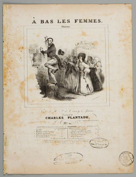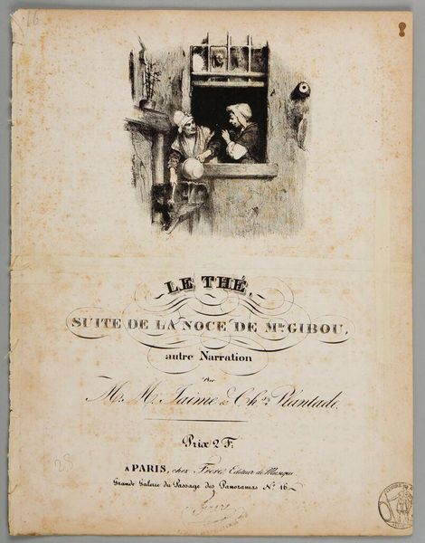 Curator: This is the sheet music cover for "Miss Gibou's Wedding Night," by Francisque-Martin-François Grenier de Saint-Martin. Editor: The image evokes a sense of quiet domesticity, perhaps tinged with melancholy; the monochromatic palette emphasizes the characters' worn faces. Curator: It's fascinating how this seemingly simple scene hints at broader social dynamics. The older woman, perhaps a relative, looms over the younger bride, suggesting generational expectations. Editor: The contrast in their poses—the elder standing, the bride seated—certainly directs our eye and implies a power dynamic rendered through graphic structure. Curator: Indeed. And the title itself, "Miss Gibou's Wedding Night," seems to invite us to consider the societal pressures and expectations placed upon women, particularly within the context of marriage. Editor: The composition creates a compelling visual story; the use of line and tone directs our reading. Curator: It's a potent reminder that even in seemingly lighthearted works, we can find reflections of deeper societal norms and power structures.