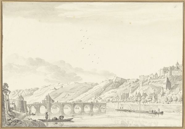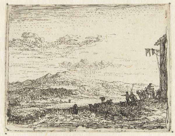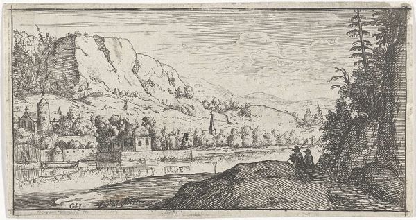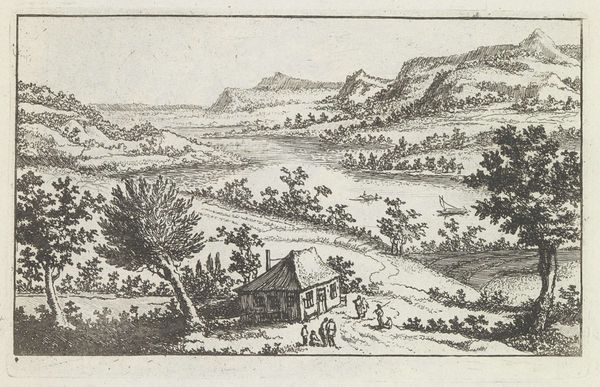 Jan van Almeloveen created this river landscape with bridge and island in the 17th century using etching. The composition presents a panoramic view, meticulously detailed with fine lines that define the landscape’s varied textures. Notice how the artist employs line to structure the scene: from the rough, overgrown banks in the foreground to the distant, soft hills. The river meanders into the background, punctuated by boats and a small island, leading the eye deeper into the pictorial space. The contrast between light and shadow further articulates forms within the landscape. Almeloveen uses a semiotic structure to communicate the various elements of the natural world and human activity, creating a scene that transcends mere representation, inviting contemplation on the relationship between humanity and nature. Consider how Almeloveen challenges our perception of landscape art. By presenting a detailed yet expansive view, he not only captures the likeness of the scene but also engages with broader philosophical ideas about space, nature, and human presence.