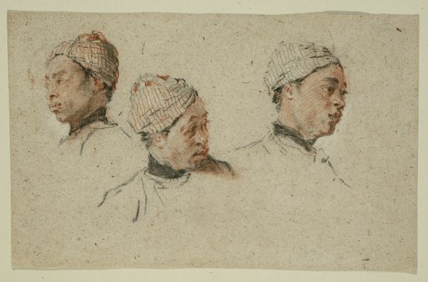 Curator: Here we see a drawing from the British School, currently untitled, that depicts two bust-length portraits of a man wearing a turban. It's rendered in ink on paper. I'm struck by the clarity of the lines, even with such a small support. Editor: The turbans themselves evoke a strong sense of cultural memory. The form and fabric speak to traditions of adornment and identity—what stories might they tell about the wearer's status or beliefs? Curator: Absolutely. Turbans historically signified rank, religious affiliation, or tribal identity across various cultures. These details are likely laden with socio-political implications, offering a window into colonial encounters. The gaze of the man facing forward feels direct. Editor: There's a psychological depth to the figure on the left—a sense of quiet dignity, even under scrutiny. The beaded necklace and the folds of fabric could represent layers of meaning beyond mere representation. Curator: The artist's choice to present one figure in profile and the other head-on suggests a desire to capture a fuller, more nuanced understanding. The art reflects not just a person, but also a culture observed through a colonial lens. Editor: It's a potent reminder of how images shape our perceptions and carry cultural weight. The drawing invites us to contemplate the complexities of cultural exchange and representation. Curator: Indeed, a small study with so much to say.
