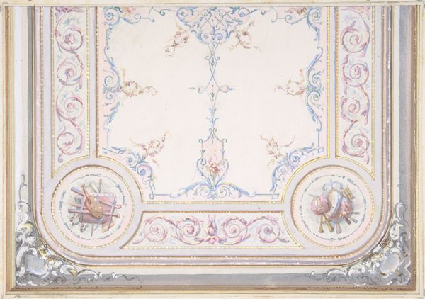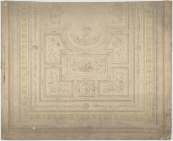 Editor: Here we have an anonymous 19th-century drawing titled "Ceiling Design, Half of a Circle," rendered in pencil, colored pencil, tempera, and print. It's currently housed at the Met. I'm really struck by the ornate detail, yet there's something quite restrained about the muted color palette. How do you interpret this work in the context of its time? Curator: The restrained palette, in dialogue with such overt ornament, presents a fascinating tension, doesn't it? Consider the 19th century: revolutions, shifting power dynamics. Neoclassicism, evident in the design, harkens back to a perceived golden age of order and reason. But romanticism simmers beneath. Editor: So the design could reflect broader societal tensions between order and upheaval? Curator: Precisely! Think about who would commission such a design. The aristocracy clinging to power? A rising bourgeoisie attempting to legitimize themselves through association with classical ideals? Who benefits from perpetuating ideals of order and beauty? This artwork becomes a site where power and ideology are negotiated. Editor: It's almost like the ceiling itself becomes a canvas for projecting societal aspirations and anxieties. But where do ideas of identity, gender and race fit into a ceiling? Curator: Good question! Consider this. Ceilings traditionally function as places of elevation; so in a socio-political setting it embodies a hegemonic ‘high ground’ that normalizes privilege, access and class divides within society. In what other ways can we imagine and express this ‘high ground’ within a culture? Editor: Wow, I hadn't considered it that way before. I see now how the aesthetic choices can reflect deeper cultural currents. Curator: Indeed! And by interrogating these designs, we start to question whose values are literally elevated and whose are suppressed. It forces us to consider the unseen labor and social structures upholding even the most beautiful facades. Editor: That's given me a completely different way to appreciate not just this drawing, but also the art around us and the power structures inherent within the art!