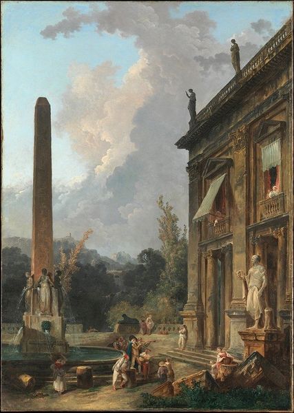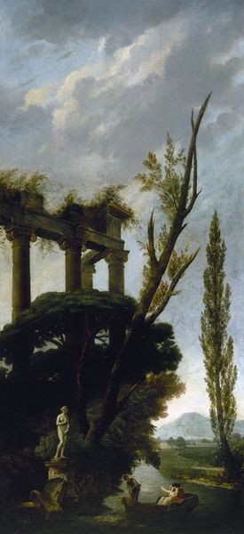 Hubert Robert created "The Ruin," an oil on canvas, conjuring a landscape dominated by classical decay. A crumbling structure commands the right side of the canvas, its Doric columns standing in silent testament to vanished grandeur. Notice how Robert employs contrasting scales. The figures in the foreground are dwarfed by the architecture, emphasizing humanity's fleeting presence against the backdrop of enduring, though decaying, structures. Light and shadow play across the ruined edifice, highlighting texture and form, while the sky, brushed with delicate hues, suggests the passage of time. The composition invites contemplation on the themes of impermanence and the cyclical nature of history, a common preoccupation in the Enlightenment. By juxtaposing the remnants of classical civilization with contemporary figures, Robert evokes a semiotic interplay between past and present, challenging fixed notions of historical progress. The ruin becomes more than just a visual motif. It acts as a signifier for broader philosophical questions about time, memory, and the transience of human endeavors.