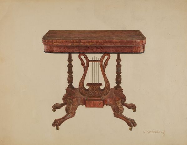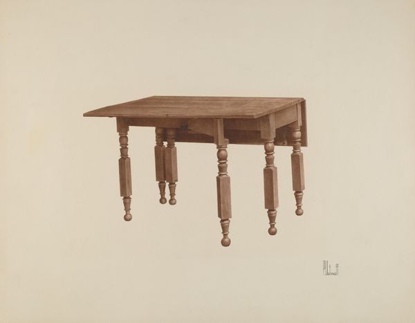 Curator: Here we have Vincent P. Rosel's "Table," a watercolor drawing likely created around 1937. What's your first impression? Editor: It strikes me as unassuming, almost shy. The delicate watercolors and the subject matter, a simple table, lend it a certain modesty. There's a tenderness in the rendering. Curator: Yes, it's quite intimate, isn't it? This drawing reflects a specific moment in the history of design, situated as it is in the late 1930s. The illustration may well have served as a technical illustration, or more likely, to depict a piece intended for mass production. The clean lines coupled with slight ornamentation. Editor: I am really intrigued by this potential connection to mass production. It gives me pause to consider the way functionality, art, and access come into play here. In what ways would mass-produced furniture reach diverse demographics, or be exclusive based on other identity factors such as wealth and status? Curator: Precisely! We can think about the politics of space, ownership, labor, and access, all refracted through the lens of something seemingly benign, a simple piece of furniture. Editor: Absolutely, the table here depicted seems both ubiquitous and individualized through Rosel's touch, raising questions around gendered or raced access to home ownership. What does having such a place symbolize and mean? It allows for us to connect themes of domesticity and social and economic power dynamics that were especially urgent at the time, as well as contemporary inequalities, and continue to require structural attention. Curator: Rosel's "Table" serves as a fascinating lens to view our own assumptions about design and production and its impact on our world. The art world has certainly historically neglected utility, or designs geared toward use. Editor: Ultimately, what I am reminded of by the illustration, especially given our present moment, is a renewed responsibility we have to each other as citizens in an increasingly tumultuous and unstable world. The way everyday images may become entangled in historical inequalities of opportunity must be understood for us to act justly. Curator: That's beautifully put, offering a profound perspective on this simple drawing. It serves as a good reminder that seemingly mundane objects have such intricate stories and continue to shape our world and the lives within it.