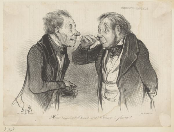 Editor: This is Honoré Daumier's 1838 lithograph titled "Actionnaires de mines... (Mine Shareholders...)". It’s a monochrome print depicting two men in top hats, closely examining a document. The scene feels fraught with tension. I’m curious, what catches your eye about this particular lithograph? Curator: The linear arrangement, of course. Daumier orchestrates our gaze through precise markings of shadow and light. Notice the meticulous detail in the rendering of their garments. The graphic treatment, particularly the hatched lines building form, suggests depth on a fundamentally flat plane. Note how the eyes form almost the focal point for where we as a viewer should be led. Do you perceive an interaction, something beyond the depicted subjects? Editor: I do. The men's proximity and focused expressions hint at a shared concern, perhaps anxiety over the contents of the document. It’s palpable! Curator: Indeed. Daumier's skill lies in extracting emotion through controlled mark making. Observe how the slight exaggeration of features doesn't descend into caricature, but enhances expressiveness. He harnesses line and form not simply to depict, but to interpret. Editor: So the content of the document is less important than the expressions and the dynamic between the figures themselves? Curator: Precisely. The subject, rendered with such compelling geometry, exemplifies the potency of Realism to use the every-day as means for interpreting humanity’s responses to such socio-political machinations. The interplay of light and dark invites reflection. The scene serves almost as an allegory, it offers questions around greed. Editor: I now see it. Focusing on Daumier’s intentional arrangements provides a profound insight into the artwork and its communication beyond the representational subject. Curator: It illustrates how a deliberate formal arrangement expands into meaningful cultural insight, providing discourse rather than simple representational art.