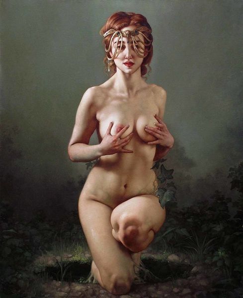 Curator: Let's delve into Roberto Ferri’s "Gea" from 2013, a powerful oil painting steeped in allegory and executed with remarkable realism. Editor: Woah, first impression? Intense! It's got this Caravaggio-esque vibe, all drama and shadow, but there’s also a tenderness, especially in her face. A slightly weird mashup, actually. Curator: Absolutely. Ferri engages deeply with the chiaroscuro tradition, enhancing the painting’s emotional depth and symbolic weight. We see this interplay of light and shadow creating a theatrical intensity but through an interesting lens of contemporary surrealism. It challenges conventional notions of beauty. Editor: Definitely throws some curves into the whole "beauty" debate. Blindfolded, seated on, or perhaps emerging from, a stark skull… It hits you with that mortality thing pretty hard. A sort of surreal and visceral reminder that we're all just... passing through, I guess. Does that resonate with Gea, the earth goddess herself? Curator: Precisely. The work grapples with complex themes surrounding mortality, fertility, and blindness. The figure of Gea, rendered blindfolded with subtle streams of blood, invites an exploration of power, vulnerability, and perhaps, even environmental destruction in contemporary times. The work might also encourage discourse on gender and societal expectation regarding body image. Editor: That blood…it is a bit disturbing. I feel like there is definitely a link with something dark lurking beneath this otherwise beautiful woman in this picture, perhaps representing our destruction. A dark and very strong statement! The blurred underpainting, adds to a sense of uneasiness too. The question is...Is she emerging or sinking? Curator: Indeed, these elements work together to create a painting rich in interpretive possibilities. "Gea" reflects broader concerns in art history—challenging and engaging the viewer beyond simple aesthetics. It prompts discourse about how we are meant to "see", regarding cultural narrative of art throughout time, and especially the representation of the female form. Editor: I agree. Thinking about it, there’s something quietly rebellious here. It’s not just a pretty picture; it’s a statement—raw, exposed, almost defiant, and even thought-provoking. I dig it. Curator: Precisely. Ferri's "Gea" compels us to see, question, and feel – that makes it undeniably powerful.