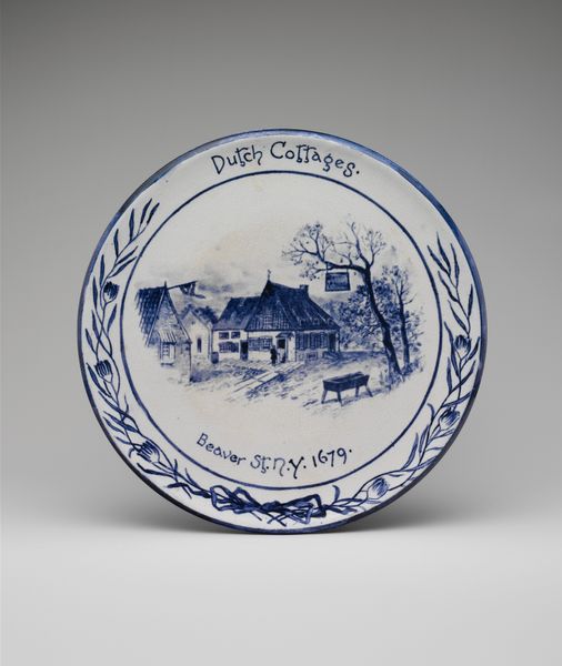 This plaque depicting Washington's Headquarters in Morristown, New Jersey, was made by Charles Volkmar using ceramic and glaze. The blue and white design is created through a process called transferware. Here, an image is engraved on a copper plate, printed onto tissue paper, and then transferred onto the ceramic surface before firing. This method, popularized in the 19th century, allowed for mass production and distribution of decorative ceramics, fueling the growing consumer market. Volkmar himself was deeply involved in this intersection of art and industry. The choice of the subject matter, a historical landmark, speaks to a growing interest in American identity. By combining this patriotic imagery with industrial production techniques, Volkmar created an object that straddles the line between art, craft, and commodity. Paying attention to these materials and techniques, allows us to appreciate the complex social and economic forces at play in the creation of even seemingly simple decorative objects.