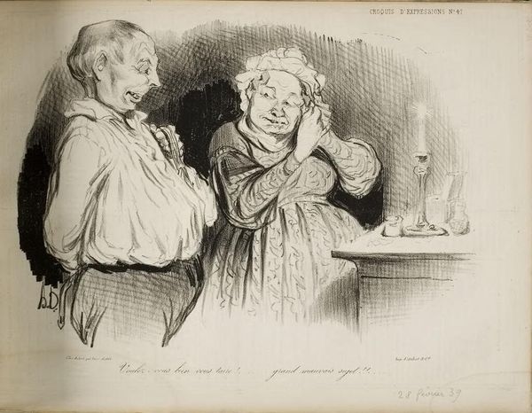 Editor: This lithograph, “Go on...kiss the teacher...right now!” by Honoré Daumier, depicts two figures at a table, seemingly enjoying a meal. The sketch-like quality gives it an immediacy. What compositional elements stand out to you? Curator: Note the contrasting directional lines. Daumier uses hatching to define form, particularly in the figures' clothing. Consider how the cross-hatching creates a sense of volume and texture. The stark contrast contributes to the narrative. Editor: So, the lines themselves are telling a story? Curator: Precisely. The varying densities and orientations of these marks articulate the characters' expressions and the overall mood. It's a study in the economy of line. Editor: That's fascinating. I see it differently now, focusing on the line work. Curator: Yes, the formal elements are critical for understanding Daumier's intent.
