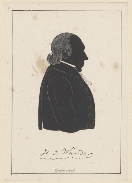 Pieter Barbiers IV created this silhouette portrait of Leonardus Meenderink using black paper and scissors sometime in the first half of the 19th century. During this period, silhouette portraits were a popular and affordable alternative to painted miniatures, allowing a broader segment of the population to participate in portraiture. The stark contrast between the black silhouette and the white background highlights the sitter’s profile, emphasizing his features and attire. His clothing and the way he wears his hair indicate his social standing and profession, possibly suggesting he was a clergyman or a member of the educated middle class. The precision of the cut reveals the artist's skill in capturing a likeness and conveying character through minimal detail. Consider the emotional weight of capturing someone’s essence through a simple, yet profound, shape. Silhouettes, in their reduction and starkness, invite us to contemplate the relationship between appearance and identity, and the stories held within a single, carefully crafted outline.