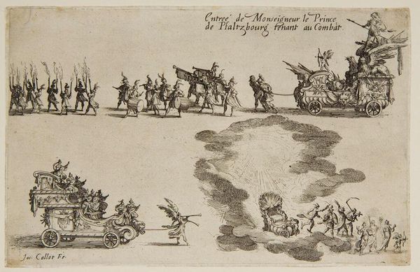 Curator: Here we have Jacques Callot's print, "Entrance of Prince de Pfalzbourg." Editor: It’s such a fantastical scene! Those elaborate, wheeled vehicles immediately grab my attention, like pagan floats. Curator: Indeed. Callot, working in the early 17th century, documents courtly spectacle. These entries were carefully orchestrated displays of power and wealth. Editor: I see symbols of both triumph and mortality. What does the burning throne at the bottom signify? Curator: That likely represents vanquished enemies. These festivals reinforced social hierarchies and legitimized princely rule. Editor: So, these seemingly whimsical elements served a rather serious political function? Curator: Precisely. It's a reminder of how visual imagery can be manipulated to shape public perception. Editor: Such intricate details, all working towards a single message. It’s a powerful statement about the role of art in shaping political realities.