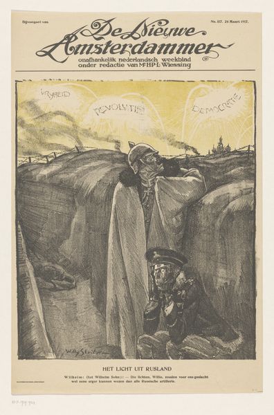 Willy Sluiter created this image, "De mobilisatiekindertjes aan de grenzen," as a cover for "De Nieuwe Amsterdammer." Sluiter made this image in a time of immense social upheaval, when war was impacting social structures, particularly around gender and class. Here, we see officials surrounding a woman and child. The men, presumably representatives of the state, loom over the mother and child, emphasizing the power dynamics at play. The dog in the image – a symbol of loyalty, often associated with masculinity – stares at the infant. This is a complicated commentary on the crisis of masculinity during wartime. The title translates to "The mobilization children at the borders," highlighting a societal concern about the children born out of wartime liaisons, and the challenges these children and their mothers faced. Sluiter’s image captures the sense of a society grappling with the transformations brought by war, challenging viewers to reflect on the personal stories behind these broad societal shifts.