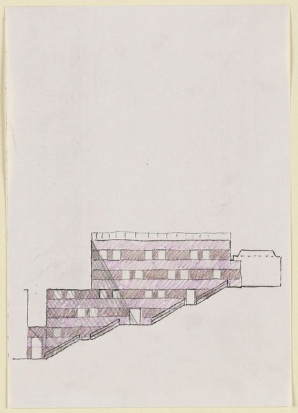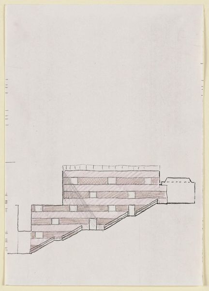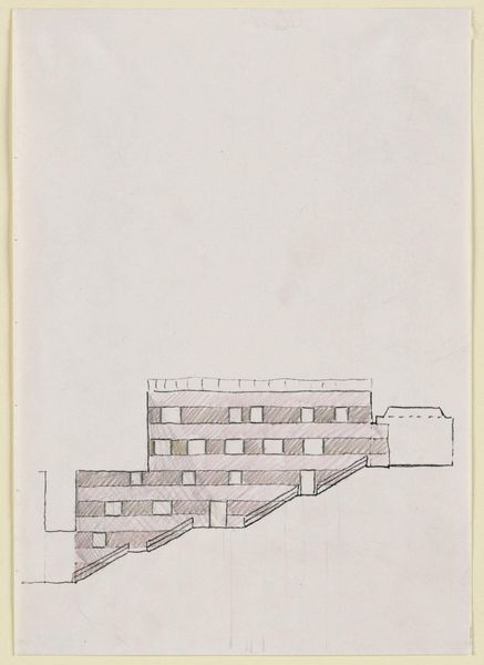 Curator: This is James Stirling's "Drawing for the Arthur M. Sackler Museum, Fenestration Study for Stairwell Wall." It resides here at the Harvard Art Museums, its dimensions just under a foot tall. Editor: It feels like a fragment, almost accidental. The hatching is so present; I'm immediately drawn to the labor and the raw process of architectural design. Curator: Indeed. The fenestration study, the pattern of openings, shows the artist's structural considerations. The composition emphasizes stark geometry and repetitive forms. Editor: And that repetitive geometry speaks to the modularity of construction, the prefabricated elements brought together to create a whole. It highlights the building as a product of industry. Curator: Perhaps, but I also see a sophisticated exploration of space and light. The interplay of solids and voids creates a dynamic visual rhythm, an internal logic. Editor: I can appreciate that, but I'm more interested in what this drawing tells us about the construction and the materials, the physical reality of the building. Curator: A compelling point. Ultimately, the drawing invites us to contemplate the relationship between artistic vision and built form. Editor: Yes, the architecture's physicality and the draftsperson's hand leave a lasting impact.