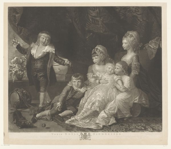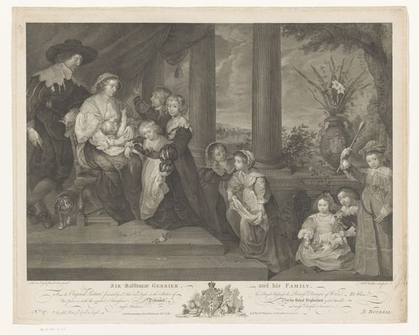 Editor: This is "The Death of Leonardo da Vinci," a print by Joseph Théodore Richomme, made sometime between 1820 and 1830. It has this very dramatic, almost theatrical mood about it. What symbols or underlying cultural memories do you see being referenced in this work? Curator: Notice how the artist presents François I cradling Leonardo, a tender scene meticulously staged to convey a specific narrative. The gesture of the King supporting Da Vinci creates a powerful visual association – can you see a resemblance to images of the Pietà, where the Virgin Mary cradles the dead Christ? Editor: Oh, that's interesting. I hadn't made that connection! Curator: Richomme leverages the Pietà's established symbolism to elevate Leonardo, imbuing him with a saintly, almost divine aura in his final moments. The surrounding figures, their expressions ranging from grief to quiet contemplation, reinforce the gravity of the scene. Doesn’t it invite a reflection on artistic genius and mortality? Editor: It does. The details, like the cross and the praying figure on the left, almost make it look like a religious experience as much as a death scene. Curator: Precisely. The cultural memory of the Pietà gives "The Death of Leonardo da Vinci" another symbolic layer, allowing Richomme to articulate Da Vinci’s significance beyond mere artistic skill. It speaks to legacy. What do you make of it now? Editor: I see how Richomme used existing visual language to communicate Leonardo's importance in a very potent, readily understandable way. It's not just a historical depiction; it's a statement about art and genius, drawing from very powerful symbols. Curator: Exactly! Cultural memory is often embedded in images, allowing artists to express complex ideas succinctly. It gives the piece a certain immortality.