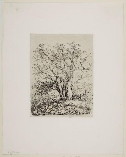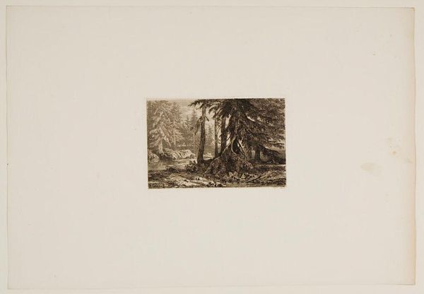Editor: So, here we have Adolphe Appian's "The Surroundings of Menton." The texture almost feels like it's been woven. What do you see in this piece? Curator: It feels like a memory, doesn't it? A hazy recollection of a place. Appian captures a mood more than a scene. I'm reminded of those fleeting moments when light and shadow dance together, creating a dreamlike atmosphere. Do you sense that too? Editor: Absolutely. It's almost romantic. I wonder what the artist was feeling when he etched this. Curator: Perhaps a touch of melancholy, a longing for simpler times? The darkness is comforting, not ominous. It's a place to escape to. Editor: I see what you mean! It's like a visual poem. Thanks for sharing your perspective! Curator: My pleasure. Every artwork holds a world of untold stories.