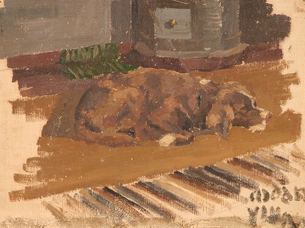 Curator: Ah, there's such a feeling of coziness radiating from this piece! Editor: Indeed. This is "Dog on a Chair," an 1882 oil painting by Sir John Lavery. What’s striking to you about it? Curator: Well, first of all, that dog looks utterly at home! I imagine it just hopped up there while Lavery was preparing his paints, as if to say, "Paint me, you must." But beyond the sheer adorable-ness of it, the palette gives me this autumnal vibe. Do you feel that, or is it just my seasonal affective disorder kicking in? Editor: I see where you're coming from with the autumnal reading. Considering the materiality of the oil paint—think about the process of layering those browns and oranges to evoke texture, the dog’s fur and the fabric’s stripes. What kind of labor went into procuring the materials, and the manufacturing of brushes, pigments? Lavery's realism does more than capture appearances. Curator: Okay, materialist! Always thinking about the underpinnings. But those earthy hues, the comfy-looking chair, and the dog's patient expression… It all tells me this wasn't some grand commission, you know? This was love; simple observation of daily life. The brushstrokes are confident, almost sketch-like in their freedom. It really looks as if he wanted to honor this furry friend. Editor: There's something so quotidian and universal about painting animals as domesticated beings. By immortalizing this creature on canvas, it almost becomes like another household belonging, as much as the striped seat it lays on. Were these dog portraits commissioned? Did Lavery breed them and commercialize his artwork after? The oil painting operates like an item, as much as it is the item pictured. Curator: Very well observed. I'm now considering this artwork as if I was there looking through Lavery's window... Such an informal moment in time; I want that dog and chair! Editor: This work highlights the intersections between fine art, animal husbandry, interior design and commerce. These animal portraiture were also quite common in the 1880s...