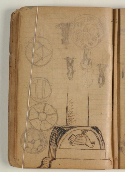 Editor: Here we have Niels Larsen Stevns's "Ornamentstudier," created between 1900 and 1904. It’s a drawing done with pencil and colored pencil on paper and held at the SMK, the National Gallery of Denmark. The composition feels like a collection of doodles. How do you interpret this work, given its arrangement and the variety of forms used? Curator: Precisely. We should analyze these forms. Consider the circles, the squares, and then the elaborate scrollwork. The shift in line quality – the delicate shading within the circular forms contrasted with the bolder lines of the larger ornament – this change introduces a visual rhythm, a sense of deliberate layering within the composition. Does this intentional interplay invite different interpretations of space and depth, especially considering how these various studies seem almost unrelated at first glance? Editor: I hadn’t thought about that. I was caught up in how random it appeared. Curator: Is it, though? Consider that even a perceived randomness can itself be a formal choice. Stevns presents the geometry first, circles and grids; then the curves arrive. By emphasizing those changes in forms he calls the viewer’s eye to different levels of the picture plane, thus re-defining our sense of pictorial space. He gives the sense of having multiple drawings co-existing, sharing one material surface. Editor: That makes so much sense. Now I see a structured thought process unfolding before me, not just some casual scribbles. I had previously considered the work as casual and free. Now it's clear how even within this study-like format, he's playing with contrasts. Curator: And we observe and understand that by attending to his arrangement and line work. Seeing its structured use, we understand his intention with more clarity.