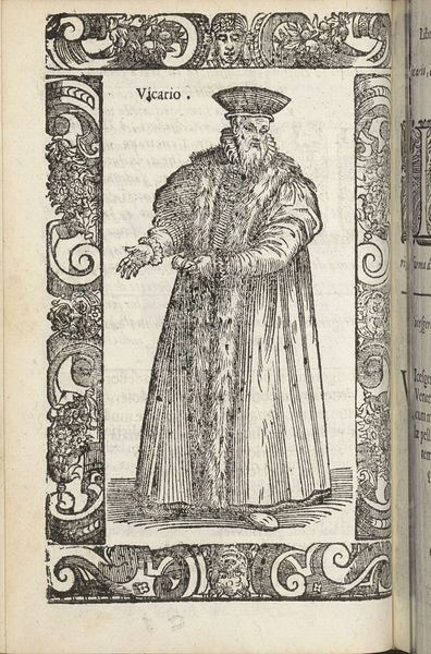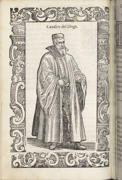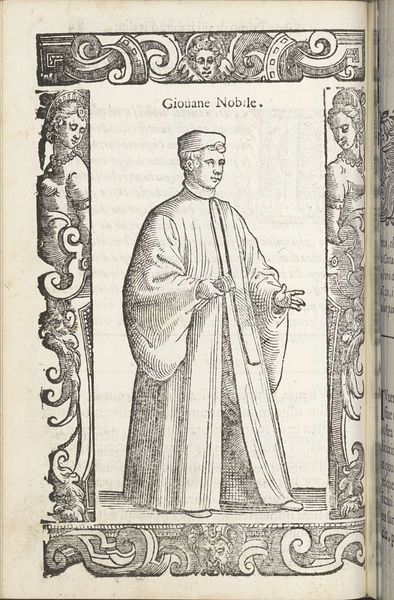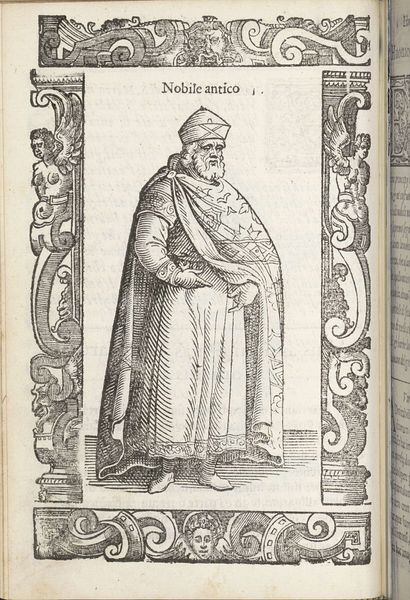 Editor: This is "Cittadini, o mercanti," created in 1598 by Christoph Krieger. It’s a print, specifically an engraving, and at first glance, it gives me a real sense of the era – a formal and slightly austere feel. What do you see in this piece, especially considering the time it was made? Curator: This image vibrates with codes and cultural meanings for its time. The very title, "Citizens, or Merchants," presents a duality, a choice of identity. Consider the elaborate border – filled with grotesque faces and symbolic ornaments. These aren’t mere decoration; they speak to a world of inherited beliefs, of dangers and moral judgments always present. Do you notice how the figure’s clothing carefully balances opulence with restraint? Editor: I do. The robes suggest wealth, but the colors are muted, almost academic. Is this a purposeful balancing act? Curator: Exactly! This isn't just a portrait; it’s a statement about social identity. The merchant class was rising in prominence, challenging the established nobility. Krieger subtly hints at that tension through visual cues: the relatively simple hat compared to the flowing robes, the confident yet not arrogant posture. What do you make of the way he holds his gloves? Editor: They seem more ceremonial than practical…like a symbol of office, perhaps? I see what you mean now; it's less about individual portraiture and more about representing a social role through carefully chosen imagery. Curator: Precisely! Every detail – from the direction of his gaze to the texture of his clothing – contributes to this carefully constructed representation. Cultural memory and social standing are inseparable. Editor: That’s really fascinating; I hadn’t considered how deeply embedded the symbolism would be in something that appears, at first, like a straightforward portrait. Curator: Yes, we carry our histories with us, especially through images, as complex emotional and historical ideas. Editor: Thank you, that was extremely insightful! I see the image, and early modern society, quite differently now.